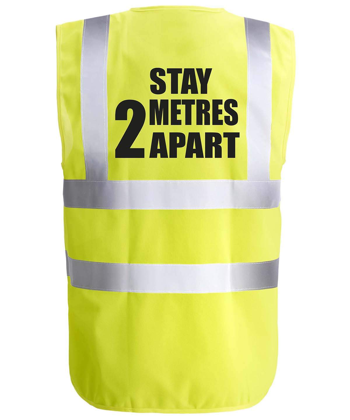 Tissu 100 % polyester avec fermeture auto-agrippante. Deux bandes réfléchissantes de 5 cm de largeur autour du corps et une sur chaque épaule. Conforme à la norme EN ISO20471:2013 Classe 2. « Restez à 2 mètres de distance » imprimé au dos du vêtement.